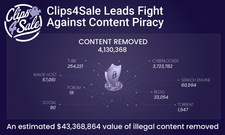 (Tampa, FL) Clips4Sale (C4S), the video clips market leader, continues to lead the industry in the fight against content piracy. When launching its Content Protection Program to tackle the growing issues related to copyright content, Clips4Sale joined forces with Takedown Piracy (TDP). Since then, C4S and TDP have removed over 4 million infringements. Additionally, we digitally fingerprinted over 7 million videos and counting on the site, further protecting Clips4Sale models and producers at no extra cost.