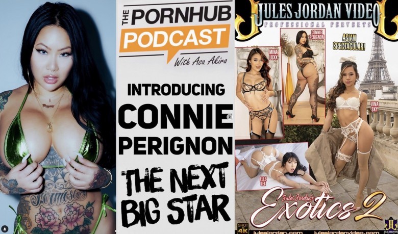 (New York, NY) Heavily tattooed Taiwanese adult performer with dangerous curves, Connie Perignon, recently guested on The Pornhub Podcast with Asa Akira, and now it’s available on all the major podcast platforms. And Connie’s first DVD with her on the cover has dropped.