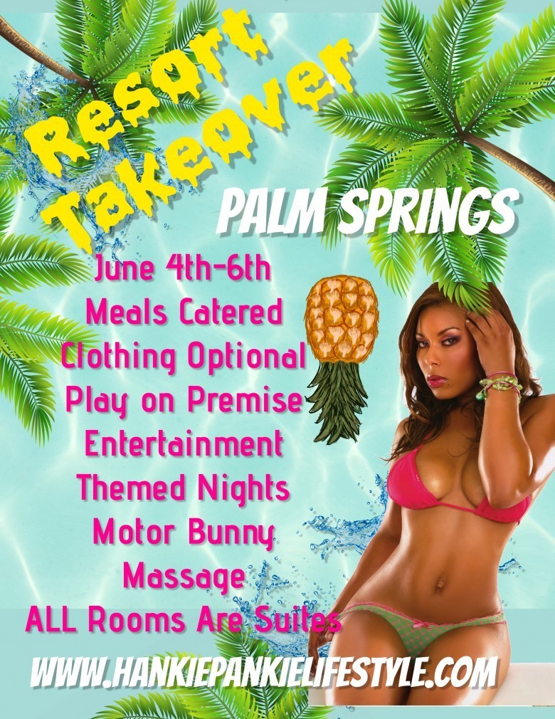 This Friday, June 4th through Sunday, June 6th, it’s a Resort Takeover in Palm Springs, CA. The three-day extravaganza takes place at a clothing-optional resort, provides catered meals, themed nights, entertainment, and much more. It’s the ultimate swingers event. Space is limited so sign up now, become a member, and get all the event details at hankiepankielifestyle.com. The host hotel is sold out, but other hotels in the area have rooms available.