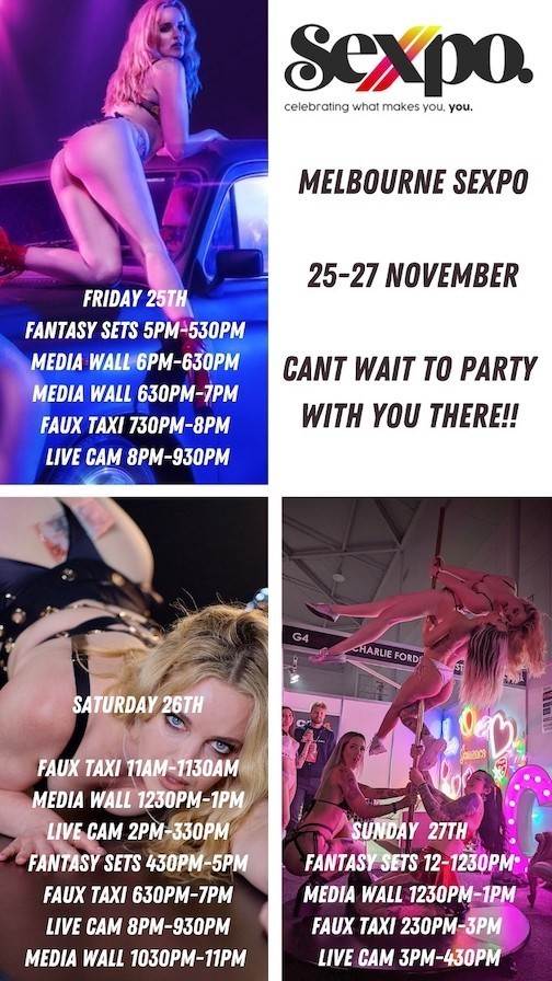 “It’s the last Sexpo of the year, and I’m pulling out all the stops with my own booth, lots of appearances at Faux Taxi, the Media Wall, and Fantasy Sets. Plus, I’m doing live shows for CAM4, so those who can’t make it to Melbourne can still spend some quality time with me. It will definitely be an epic weekend!” says Charlie Forde.