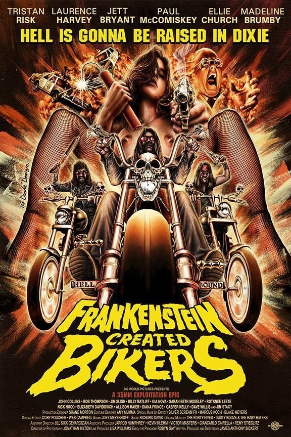 "Frankenstein Created Bikers," a sequel to the 2011 grindhouse classic "Dear God No," is about an outlaw biker who finds himself addicted to a diabolical substance and hunted by a grenade-tossing femme fatale, bounty hunters, law enforcement, a rival motorcycle gang, mutations, and a topless stripper hit squad. The gorgeous Nova, who has also appeared in Rob Zombie's "Halloween 2," was a tremendous source of inspiration, according to acclaimed director Bickert.